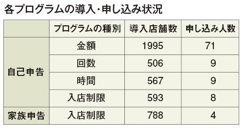 回答した店舗2062軒(回答率99.4%)の各プログラム別の状況は表のとおり。2015年10月から運用が始まった「金額」が、導入店舗数、申し込み人数ともに最も多かった。17年12月に追加された「回数」「時間」「入店制限(自己申告/家族申告)」の中では、家族申告による入店制限が導入店舗数としては最多(788店舗)で、申し込み人数では「回数」と「時間」の9人が同数で最多だった。