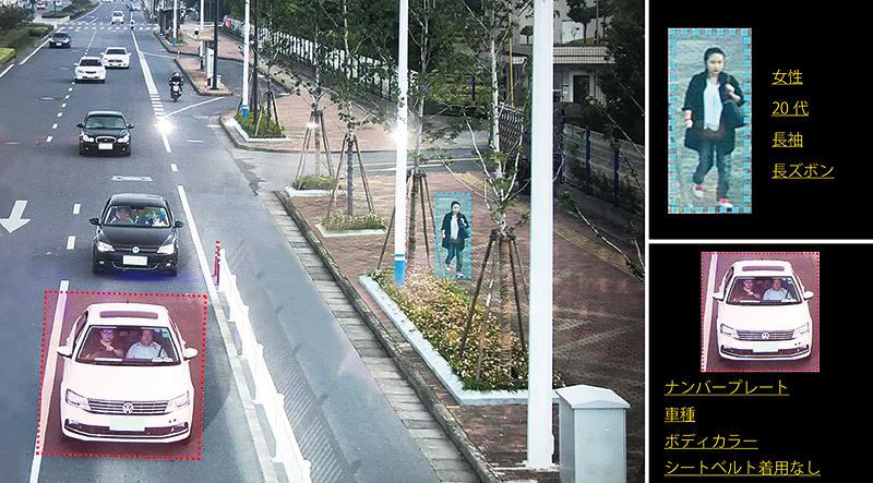 まず、人間で言えば、知識や経験に相当する判断基準をもたせるために、形や色、動き、行動パターンなどの大量なデータをAIに機械学習させる。次に、例えば「長袖・長ズボンを着用した20代の女性」という絞り込み条件を入力すれば、瞬く間に目的の人物をリストアップすることができる。同様に車のナンバーや車種・色からも絞り込みが可能。また、隣接するカメラを連携させれば、より広いエリアでの捕捉が可能になる。