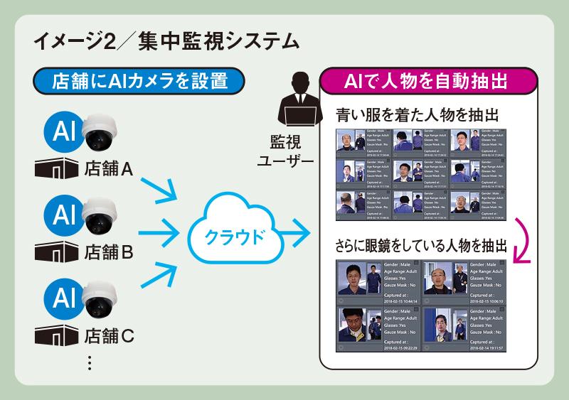システム エイ・ブイはインターネットによる複数店舗の集中監視システムの分野でも高い評価を得ている。各店舗の監視映像は、クラウドサーバーに集められ本部で一括して管理することができる(イメージ2)。映像データは膨大になればなるほど、絞り込み検索が得意なAIが本領を発揮。条件に合った人物を即時に自動抽出してくれる。