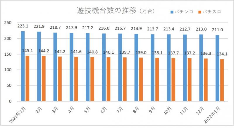 2022年02月22日No.10002678 全日遊連 加盟店舗数1月末の営業店舗数は7544軒 全日本遊技事業協同組合連合会が集計した組合加盟店舗の実態調査によると、2022年1月末時点の営業店舗数は7544軒で、前月より93軒(1.2%)減少した。新規店舗数は3軒、廃業店舗数は73軒、当月中の休業店舗数は49軒。 1月末時点のパチンコ遊技機台数は211万159台で、前月より2万263台(0.8%)減少した。パチスロ遊技機台数は134万1112台で、同2万1562台(1.6%)減少。その他を含む遊技機総台数は345万1271台だった。