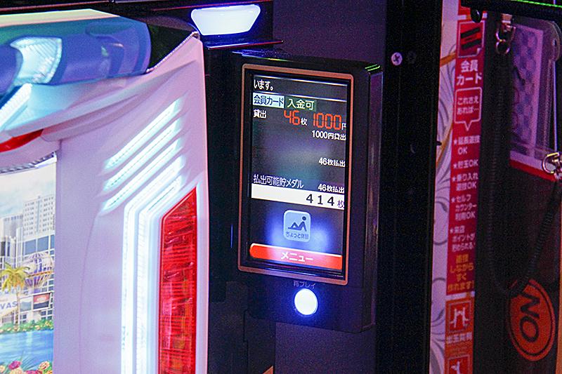 ハード面は、遊技機と専用ユニットのほか、データ表示器を導入。メダルレスで出玉が見えにくいスマスロの出玉状況を目に見える形でカバーした。また、離席時のトラブルを避けるため、レバーに引っ掛けられる専用の離席札、コンプリート機能発動時に使用する専用札も用意した。