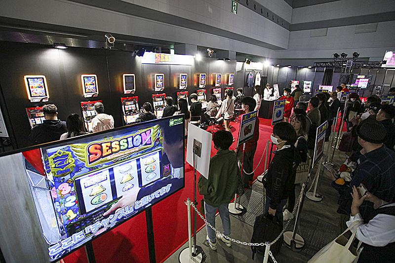 「A PROJECTブース」には、この日のために開発されたパチスロ機『SESSION』の試打ブースを用意。同機を遊技してボーナスを引くことができれば、ペンダントやスウェットなどの賞品がゲットできるとあって、多くのノーマルタイプファンが集まった。