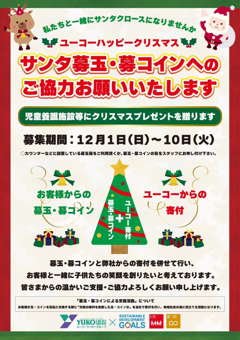 福岡を中心にパチンコホール19店舗を展開するユーコーラッキーグループ(久留米市)は12月1日から10日まで、グループ全店で「サンタ募玉・募コイン」を実施。遊技客から集まった善意をおもちゃやギフトカードなどのクリスマスプレゼントに換えて、店舗近隣の9つの児童養護施設に贈った。