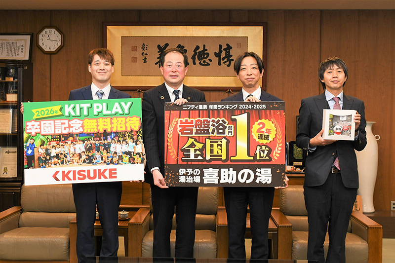 100万人目になった来場者には、「姫若子の湯」公式キャラクター・もとちかくんのオリジナルTシャツや人気のサウナグッズ、入浴券などを贈呈。記念撮影も行った。