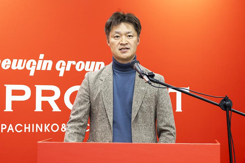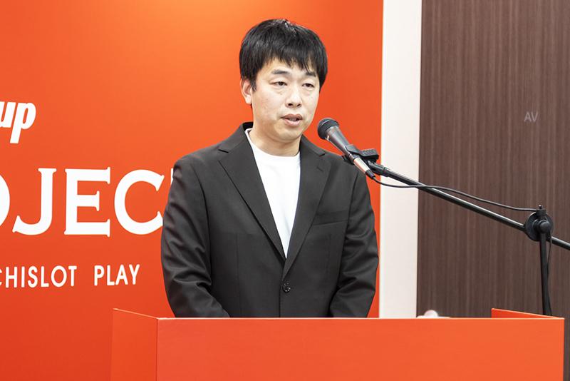 発表会の冒頭で挨拶をしたのは、同社研究開発本部部長とライツ部部長を兼任する松永崇取締役。松永取締役は「これまでパチンコに触れる機会がなかったユーザーに、ホールまで足を運んでもらえる動線を整え、楽しんでいただく環境を構築すべきと考えている。その取り組みの一環として、本プロジェクトを立ち上げた。世界を見渡すとさまざまなレジャーが存在するが、アニメとコラボできる唯一のレジャーが日本のパチンコ・パチスロ。私たちはこの日本の文化を大切にして、アニメと遊技機の融合による新しい価値を創造し、みなさまに楽しんでいただく活動を続けていくことを宣言する」と本プロジェクトを立ち上げた経緯について説明した。