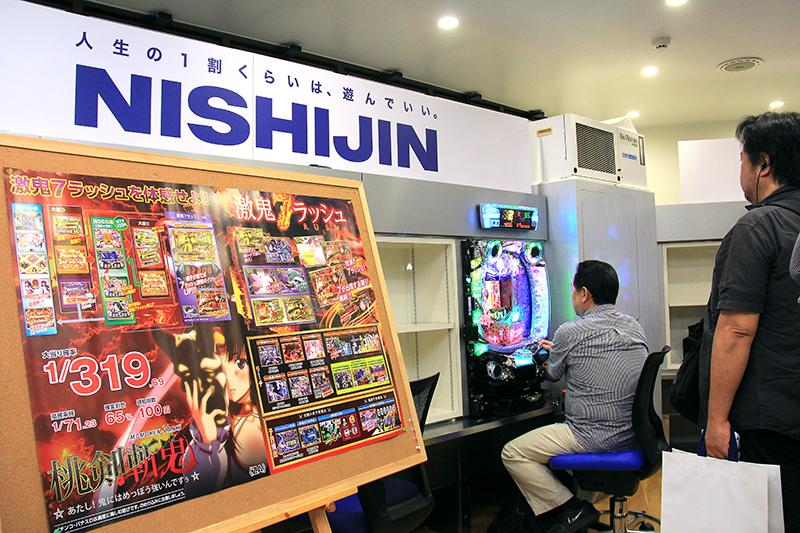 ショールームでは10月16日からホール導入予定の『CR桃剣斬鬼』の試打会も開催された。同機は大当たり確率1/319.69で、スーパー小当たりRUSHを搭載した確変割合65%のループタイプ。モモキュンソードシリーズの最新作だ。