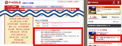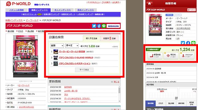 2023年04月13日No.10003420 ピーワールドが「新台入替情報の設定」をリニューアル ピーワールドは4月12日、HPの「新台入替情報の設定」をリニューアルしたと発表した。 今回のリニューアルでは、個別機種ページの設置店検索の欄に「導入予定店舗」が追加された。ホールがメンテナンスページの「新台入替情報の設定」で登録した内容が反映されている。 左がPC画面で右がスマホ画面 新台入替情報のページでは、ホールがメンテナンスページで登録した正式名称が表示されるようになっている。 左がPC画面で右がスマホ画面