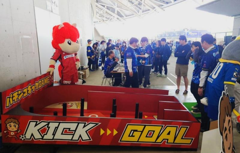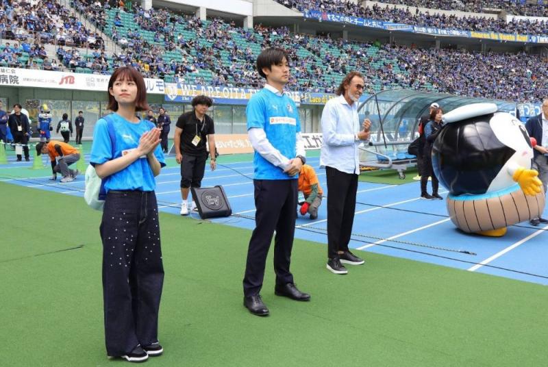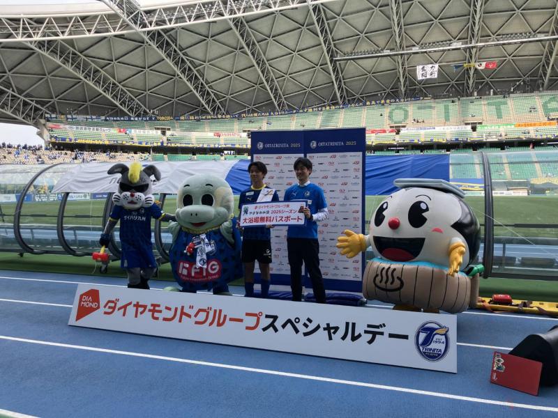 「地元大分を楽しくする」というミッションを掲げる同グループは、当日スタジアムに来場したサポーターや地元ファンに向けてさまざまな取り組みを実施した。来場者プレゼントとして「やまなみの湯オリジナル手ぬぐい」を先着8000人にプレゼント。ハーフタイムにはダイヤモンドグループ各店舗からの景品が当たる抽選会も実施した。大分県遊技業協同組合のイメージキャラクター「温泉パチロー」も登場して会場を盛り上げた。