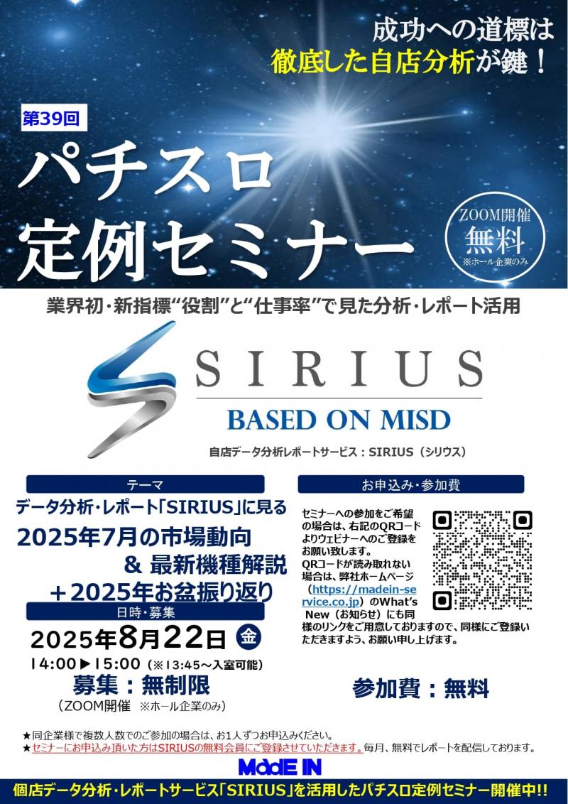 業界初の新指標を用いた自店舗実績データ分析・レポートサービス 「SIRIUS(シリウス)」を提供するメイドインサービス(東京都府中市)は8月22日(金)、第39回パチスロ定例セミナーをオンラインで開催する。