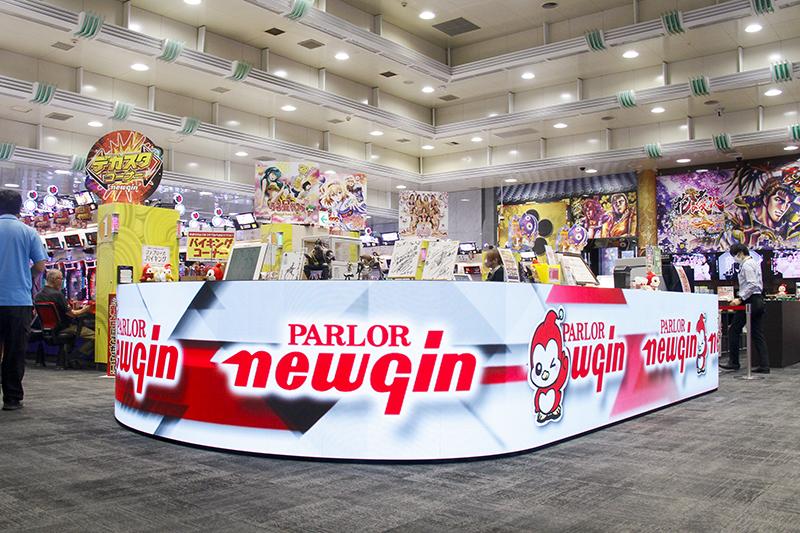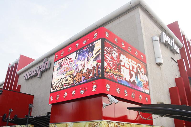 また同店は8月7日から、店内外にLEDビジョンを設置。店内はメインの出入口から入店すると正面にあるカウンター周りに配置し、店外には店舗を正面から見て右手側にL字型で設置した。このLEDでは、同社の看板コンテンツ「花の慶次」や先行導入した新台の告知などを行っている。