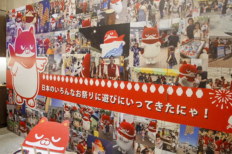 店内に入ると、バルーンでできた高さ約2メートルの巨大にゃんまるがお出迎え。飲食スペースにはにゃんまるの壁面装飾、SNS映えするフォトスポットなども用意。また同社が地域イベントなどで地域住民と交流した際の活動写真をまとめたパネルも設置していた。
