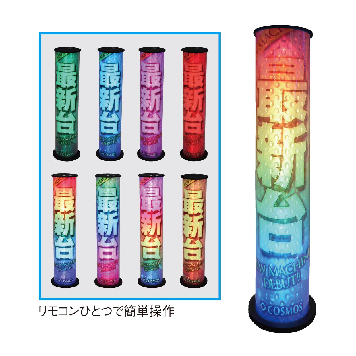 本体サイズは220φ×H965mm、対応サイズはW640×H940で電流は4A。重量は2.5kgと軽いため、島上や島入り口など使用方法はさまざま。カラーはレインボーから赤、青、緑などの単色までリモコンひとつで操作可能。