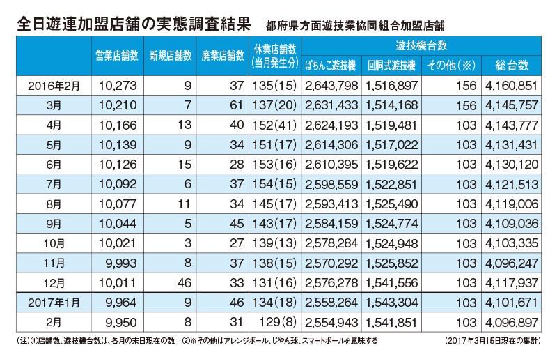 全日本遊技事業協同組合連合会の2月末時点の組合加盟営業店舗数は9950軒で、前月末比で14店舗減少した。新規店舗数は8軒、廃業店舗数は31軒。休業店舗数は129軒、2月中に休業した店舗は8軒だった。