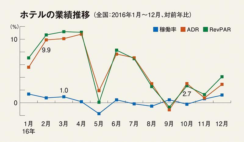 オータパブリケイションズが刊行する『週刊ホテルレストラン』の調査によると、昨年12月の全国の平均客室稼働率は77・1%。各地のホテルの声を聞くとインバウンド需要の減少もうかがえるが、平均客室稼働率は前年同月より0・3ポイント上昇した。平均客室単価も上昇したことで、重要な業績指標であるRevPAR(1日の客室売り上げを、1日あたり販売可能客室数で除した数値)も前年同月を上回った。