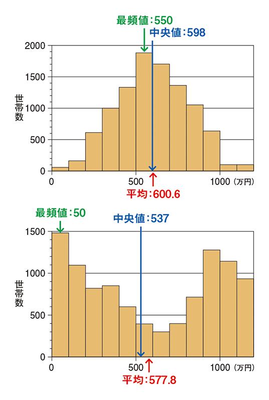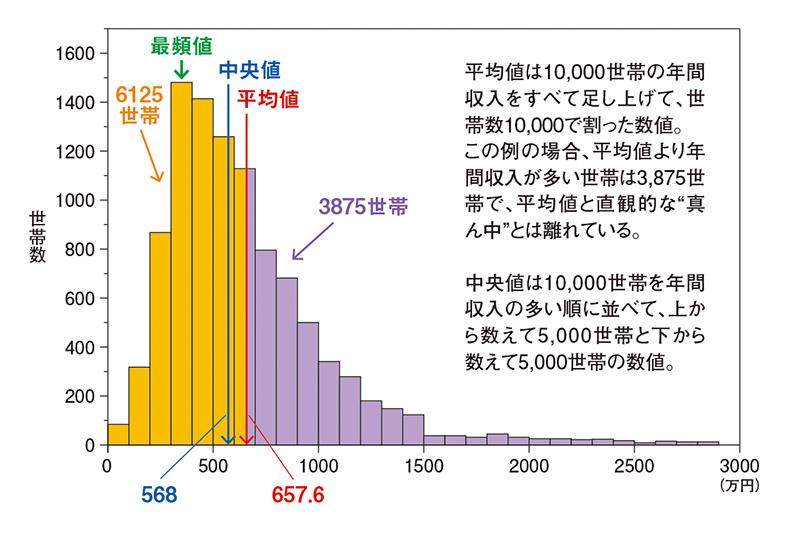 集計したデータを一つの数字で表現するにはいくつかの方法がありますが、3つある代表的な値の第一が「平均値」(算術平均)です。調査した個々の世帯の年間収入をすべて足し上げて、世帯数で割った値です。すると、平均値は657・6万円になります。先ほど、ヒストグラムから「300万円以上~600万円未満あたりの世帯が多い 」ということを直観的に見てとりましたが、平均値はそれよりも多い金額です。つまり、平均値は必ずしも大多数の数値となるわけではないのです。この例では、平均値が高めになった原因は、高収入世帯の年間収入の高さによって平均値がひっぱられてしまったためです。
