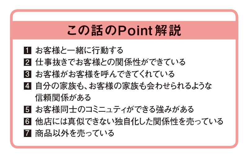 お客さまは、お客様を呼んできてくださいます。本当にお見事であっぱれでした。商品だけを売っているお店なら、どこで買っても同じです。優良店の条件が設備投資だとすれば、同じように設備投資をすれば同じ店ができあがります。ただ、それではどこにでもあるお店になってしまいます。先ほど例に挙げた車屋さんのように、独自化したお店でなければお客様自身が来店する理由づけができません。