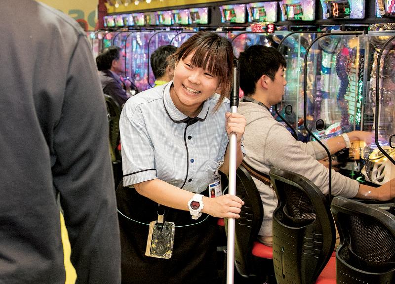 スタッフの教育に重点を置いてきた同社だけに、サービスレベルの高さは「全国トップクラス」と自負する。さらに、同店で目を引くのは清掃スタッフのサービスだ。すれ違う度に笑顔であいさつ。遊技台周辺の清掃の際には、「失礼します。足元と灰皿周りを掃除させていただきます」と元気に声かけをする。常連客と笑顔で会話する姿も印象的だ。