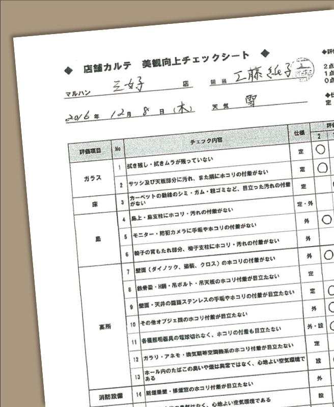 提携企業には、エムエムインターナショナルの研修を受けてからホールに入ってもらっている。また清掃の品質維持のため、エムエムインターナショナルから現場清掃スタッフを統括するトレーナーを3カ月に1回派遣。「店舗カルテ 美観向上チェックシート」と名付けられたチェックシートを基準に、清掃スタッフの業務状況を確認している。このシートは、エムエムインターナショナルと提携企業、導入店舗で共有され、業務向上に役立てられている。