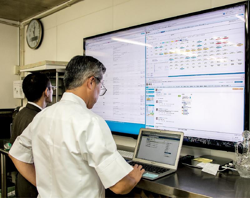 パートを含めた40人以上の全従業員がパソコンやタブレットで客の食事の好みや来店頻度をチェックするほか、急な情報共有や要望に対応する。先のケースでは、「将棋に興味がある」という情報をすぐに社内SNSに上げ、それを見た他の従業員が対応をしたわけだ。