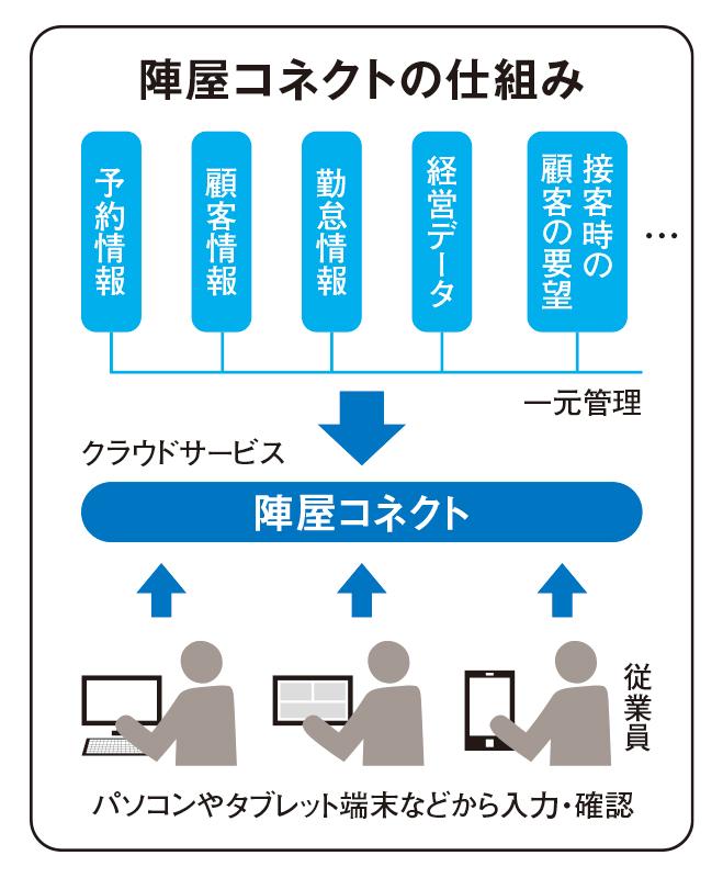 陣屋では「陣屋コネクト」と呼ばれるシステムで顧客管理をしている。開発者は宮崎富夫社長本人だ。宮崎社長は2009年10月に4代目に就任。「情報共有」の必要性を痛感し、すぐにシステム開発に着手。3カ月後の10年1月には現場で活用し始めた。