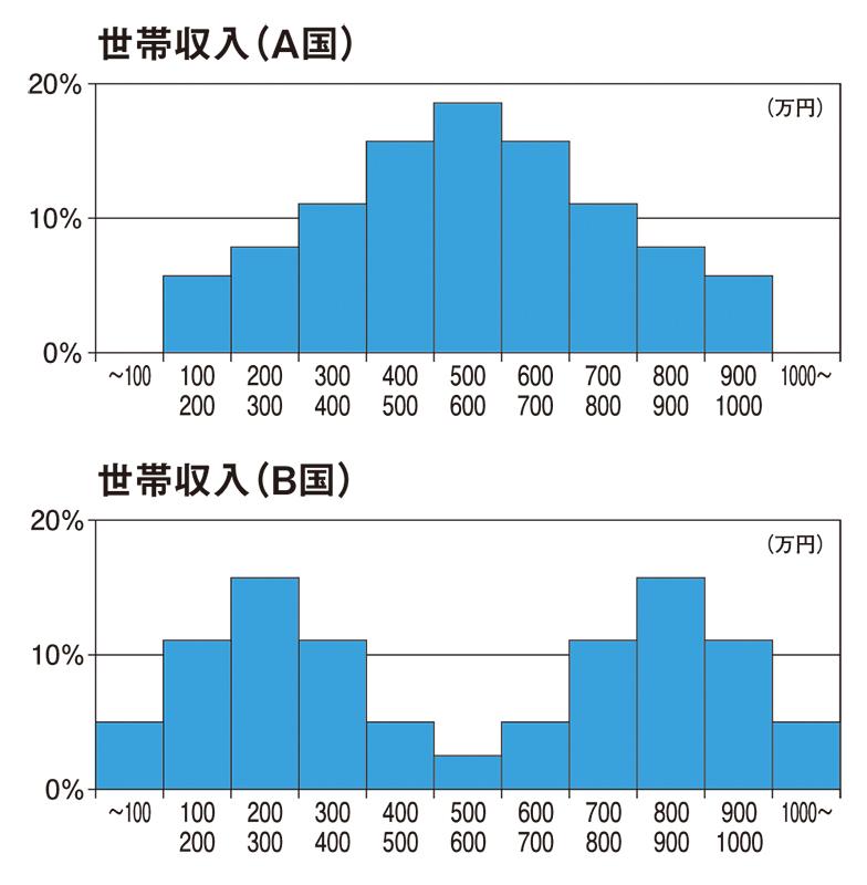 ヒストグラムが、峰が1つの山型(単峰性)でない場合、この集計の中には異質なグループがあると推測できます。先のB国の例でいえば、高収入層と低収入層です。