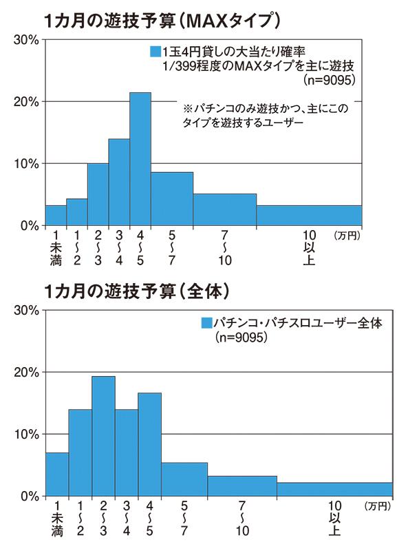 例えば、パチンコ・パチスロユーザーの「1カ月の遊技予算」を調べても、きれいな単峰性の山型にはなりません(下左図)。回答者の中には、4円貸ユーザーと低玉貸ユーザーという、消費金額という面で異質なグループが混在しているからです。