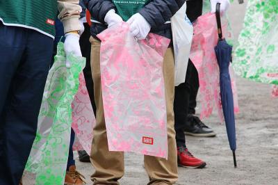 途中から再び小雨が舞い始める中、花見客のゴミも率先して受け取り、山谷堀広場に戻るとペットボトル約3150本に相当するゴミが集まっていた。
