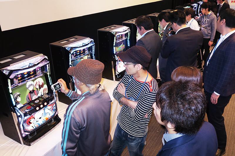 大容量の画像ロムを搭載、描画性能がアップした演出画面を撮影するプレス関係者