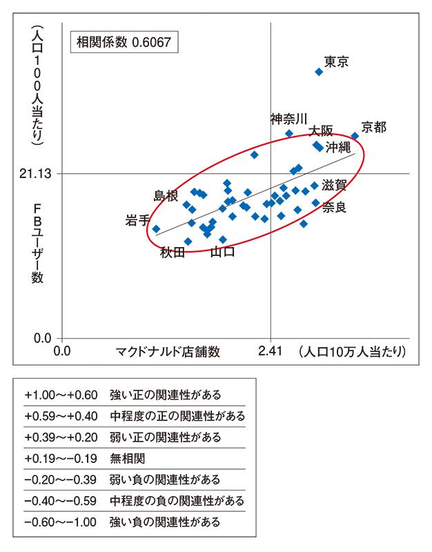 もうひとつ、一見するとマクドナルドとは全く関係なさそうな、フェイスブックのユーザー数(同様に人口100人当たりに計算)のデータを眺めてみます。ユーザー数が多いのは、東京、神奈川、京都、大阪、沖縄。少ないのは、秋田、山口、青森、岩手、山形。マクドナルド店舗数の上位、下位にも登場した都県が見られます。