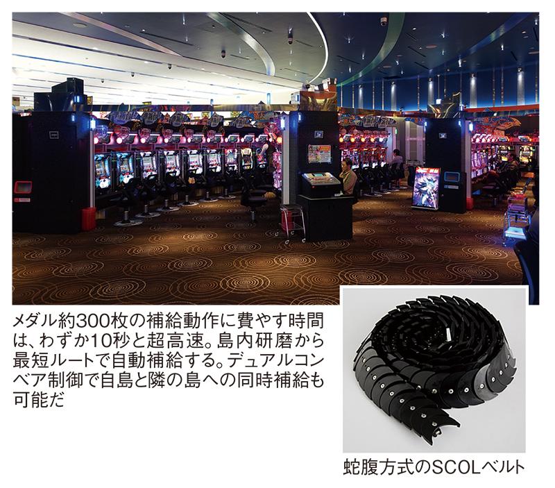 蛇腹方式のSCOLベルトを新開発。R島や円形島でもレール1本で対応する特殊形状のメダル搬送ラインだ。複数の短い直線レールを接合しないため、接合部で生じる段差はなし。衝突によるメダルの品質劣化を抑制しつつ、静かでスムーズな水平搬送を可能にした。
