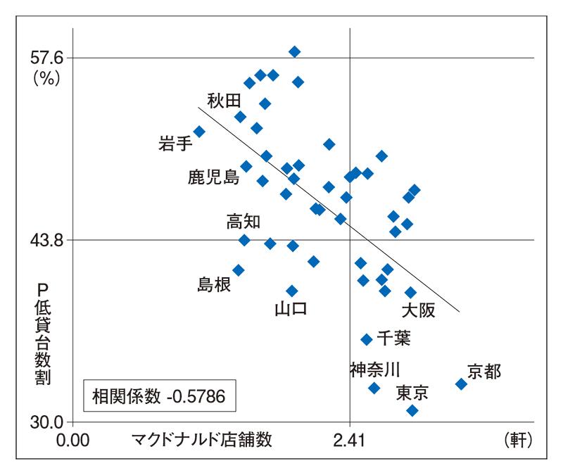 散布図を見ると、マクドナルド店舗数が多い都道府県はパチンコ低貸台数割合が低いという傾向が見えます。このように、一方が高いと他方は低い傾向が見られるとき、2つの変数には「負の相関がある」と言います。相関係数はマイナス0.5786で、「中程度の負の相関がある」と言われるレベルです。
