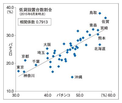 人口当たりのマクドナルド店舗数とパチンコ低貸台数割合には、相関があるでしょうか。パチンコ低貸台数割合は、週刊アミューズメントジャパン2015年8月10日号に掲載されたもので、15年6月末時点のP‐WORLD登録店舗情報をもとにピーワールドインサイトが集計したものです。