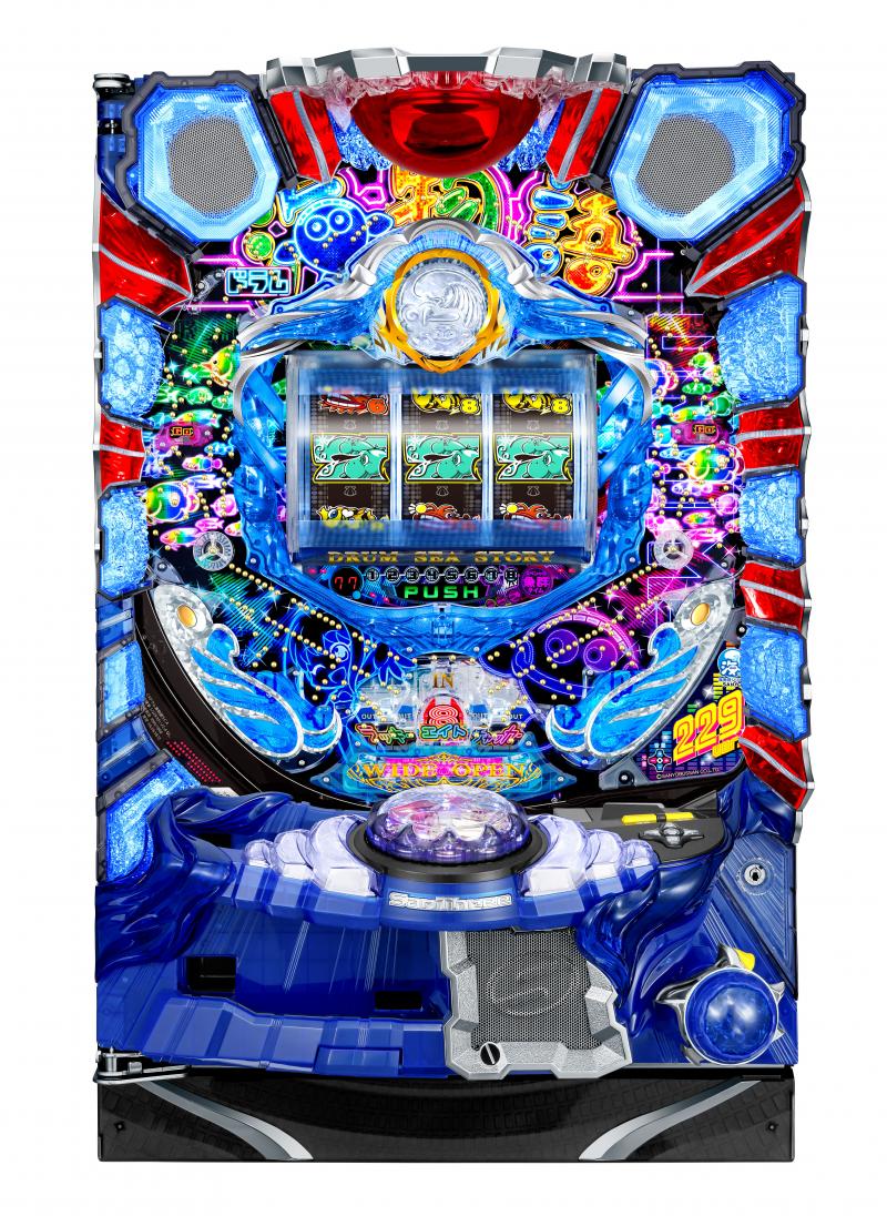 注目は海シリーズ初となるドラムタイプである点。ジュゴンをモチーフにした7図柄やお馴染みの魚たちの図柄が3つ揃えば大当たり。チャンス演出の魚群は新たに「イルミ魚群」として搭載され、ドラム機ならではの新演出も加わった。