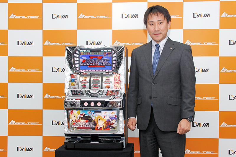 冒頭の挨拶で同社の久岡広季常務は、「遊技人口の回復に貢献できる機種。若年層に人気のある萌えキャラ要素と、中高年層に広く認知されたスーパーロボットの要素は幅広い層から支持を得られる」とコンテンツを紹介。スペック面では、「5.5号機ならではのMB(CT)を利用したART機で、短時間遊技でも楽しめる仕上がりになっている」と導入価値を示した。
