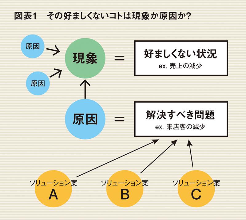 「売上が落ちている。この状況をどう解決するんだ?」という経営者の問いに対する、「はい。売上を上げます」といった、コインの裏表のような答えは何ら解決策を提示していない。表出した現象の根底にある問題こそ、「解決すべき問題」なのだ。