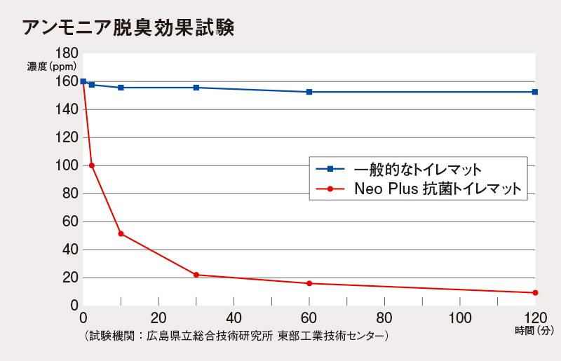 『Neo Plus抗菌トイレマット』は、消臭・抗菌など飛び散った尿への対処を目的に開発されたマット。マットに付着した尿をものの6秒で吸収し、マットの表面をサラサラにする。広島県立総合技術研究所の東部工業技術センターが行ったアンモニア脱臭効果試験では、マットに尿が付着した際に160あったアンモニア濃度が2分で減少。120分後には消臭・除菌がほぼ完了していた。