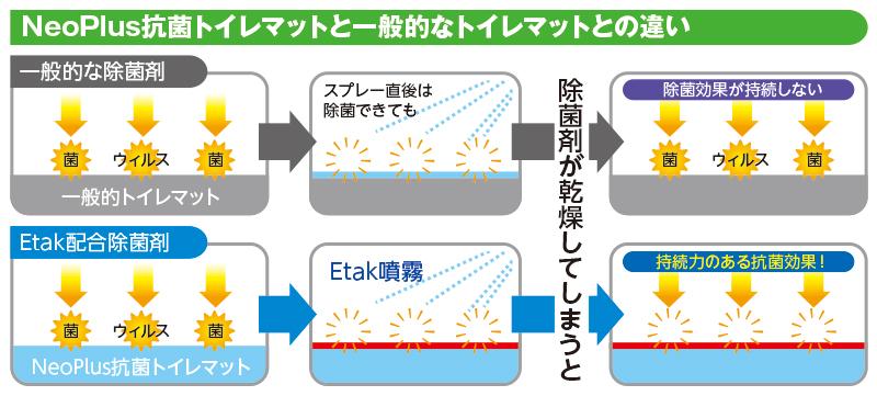 秘密は、珪藻土・砂・良質食物繊維を使った特殊構造と、専用の除菌剤『Etak』にある。一般的なマットと違いアンモニアを脱臭する力を備え、専用の除菌剤は持続性防菌と防ウイルス成分を配合。除菌剤の除菌効果試験では、一般の除菌剤が乾燥後除菌効果を失うのに対し、除菌剤『Etak』は乾燥後も除菌効果が継続する効果が確認された。除菌剤は、2週間に1回の塗布だけで抗菌効果が得られるという。