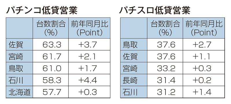 都道府県ごとに見ると、パチンコの低貸台数割合が高いのは、佐賀(63.3%)を筆頭に宮崎、鳥取、石川、北海道、熊本。佐賀は前年より3.7ポイント、石川は同4.4ポイントと1年間に低貸台数割合が目立って高まった。逆に低貸台数割合が低いのは、東京(33.7%)を筆頭に、神奈川、京都、千葉、愛媛、大阪で、大都市を擁する都府県が目立つ。ただし、京都は前年より低貸台数割合が大きく高まった。