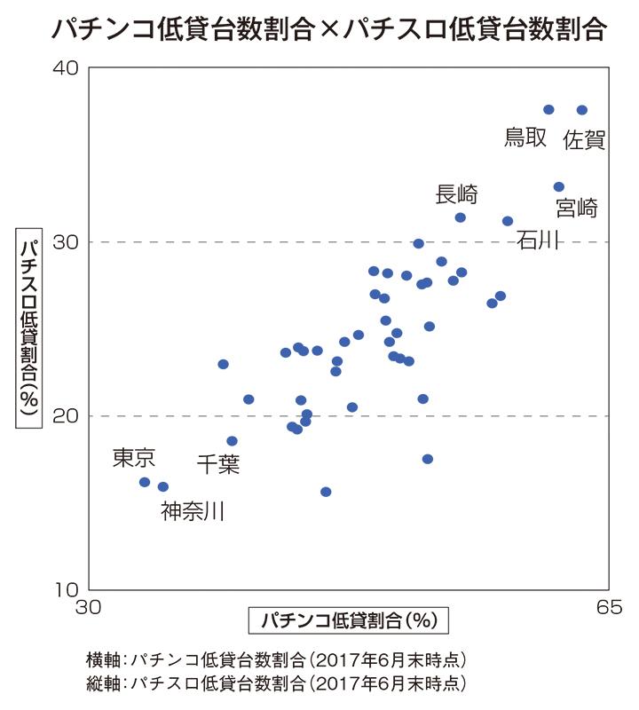 パチンコの低貸台数割合とパチスロの低貸台数割合には強い相関があり、「パチンコの低貸台数割合が高いエリアは、パチスロの低貸台数割合も高い」ということが言え、大都市を擁する都府県ほど低貸台数割合が低いことが見てとれる(図)。