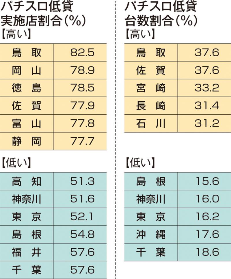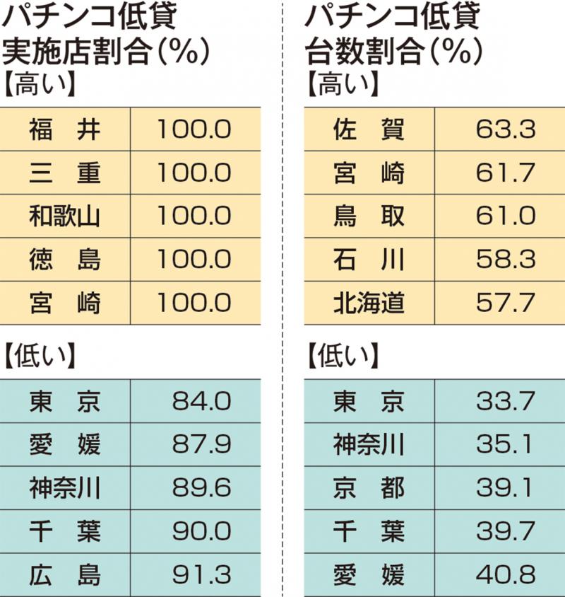 パチンコの低貸営業実施店は福井、三重、和歌山、徳島、宮崎で100%に達している。低貸営業実施店割合が最も低いのは東京で84.0%。滋賀では1年間で低貸営業実施店割合が目立って増えた。
