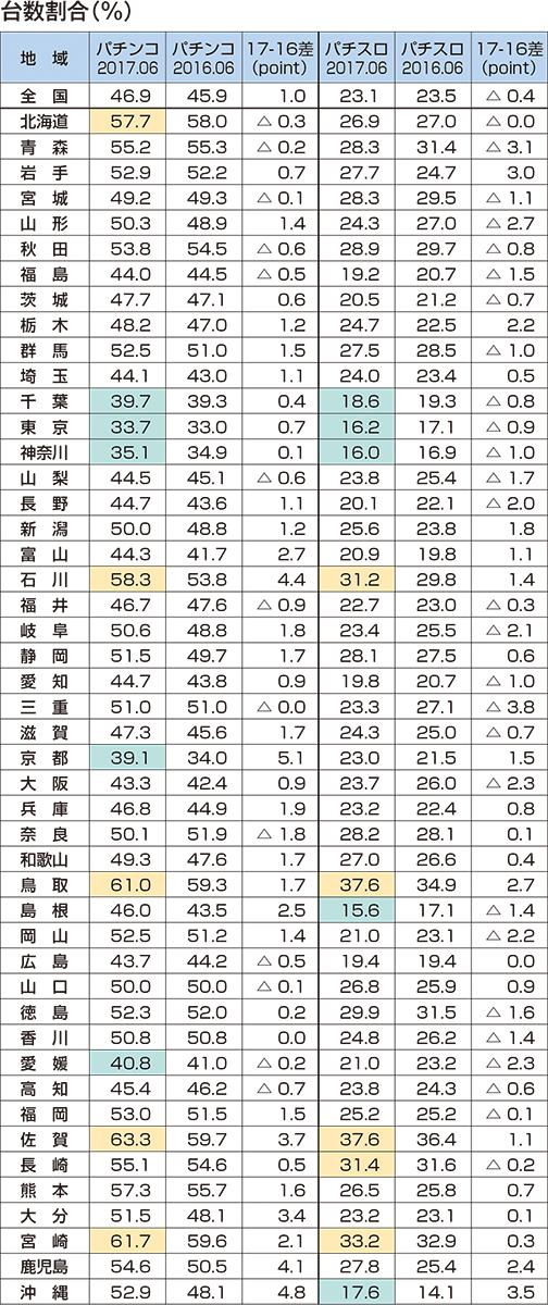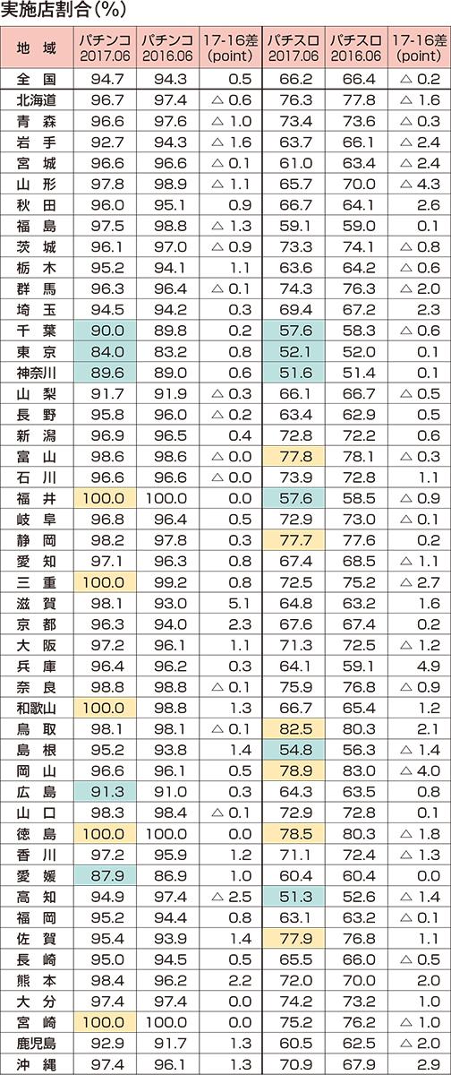 17年6月末時点の全国のパチンコの低貸営業実施店の割合は94.7%で昨年6月末時点より0.5ポイント増加、パチスロの低貸営業実施店の割合は66.2%で同0.2ポイント減少。