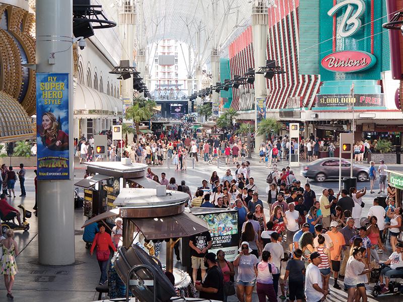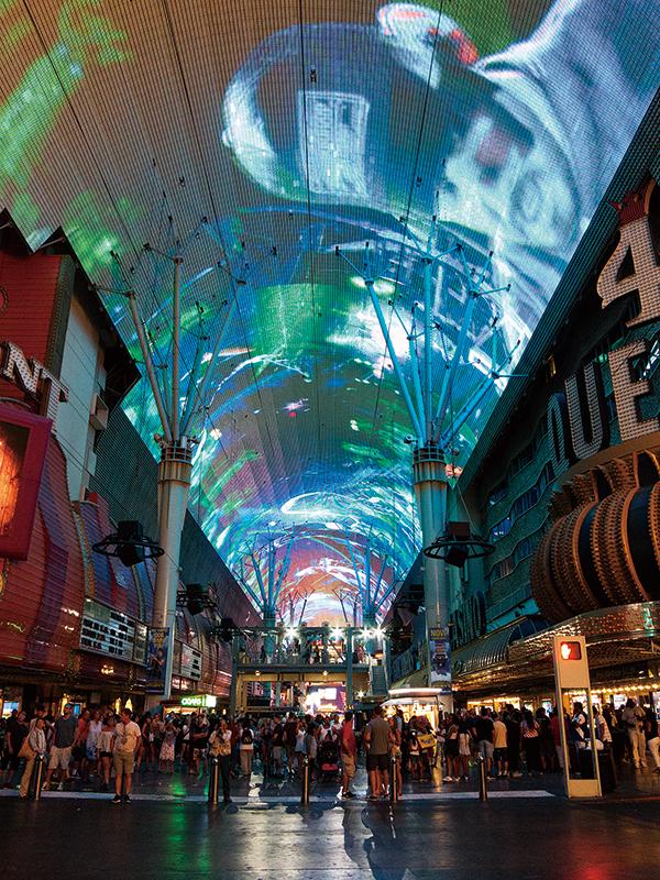 ダウンタウン地区の中心部はフレモント・ストリートという屋根付きの歩行者天国繁華街。7~8階建てのビルの高さに匹敵するアーケードには、1250万個の発光ダイオードがちりばめられている。この電飾アーケード「The Fremont Street Experience」では、日没後の1時間おきにライティング・ショーが行われ、カジノホテルの外装ネオンに負けないくらいのド派手な映像演出で歩行者天国の観光客を楽しませている。