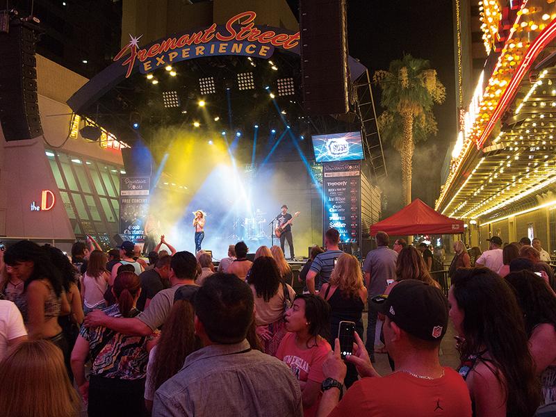 奇抜な装束やダンス、マジックなどの一芸で人の輪を作っているストリートパフォーマーたちもストリートを彩っている。ストリートの2カ所にあるステージでは無料で観覧できるショーやコンサートが行われている。この約420メートルあるストリートを往復するだけで、無料でエンターテインメントを楽しめるところが、さすがカジノが集積する街。同じラスベガスでも、高級カジノホテルが軒を連ねるストリップ地区とは違った庶民的なお祭りのような雰囲気がある。
