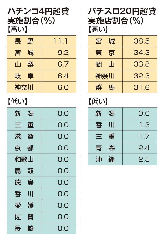 パチンコ高価貸営業実施店割合が高いのは長野、宮城、山梨、岐阜、神奈川など。過去1年間に高価貸営業実施店割合が目立って高まったのは大分、岐阜。一方で、新潟、三重、滋賀、京都、和歌山、鳥取、徳島、香川、愛媛、佐賀、長崎の11府県では高価貸営業実施店が見られなかった。