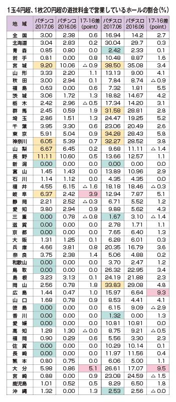 17年6月末時点の全国のパチンコ高価貸営業実施店(遊技業金が1玉4円を超える)の割合は3.0%で昨年6月末時点より0.6ポイント増加。パチスロ高価貸営業実施店(遊技業料金がメダル1枚20円を超える)の割合は16.9%で同2.7ポイント増加。