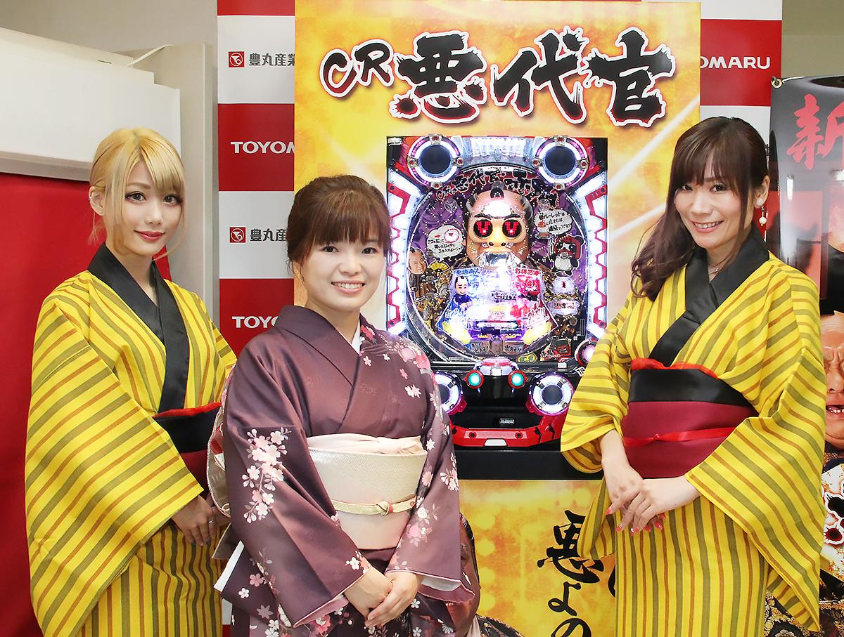 豊丸産業は8月28日、都内ショールームで新機種『CR悪代官』のプレス発表会を開催。V図柄当たり確率:開スタート1/17.0の『~CR悪代官 赤鬼X~』と、リユース対象機種で同1/6.02の『~CR悪代官DX~』を同時発表した。