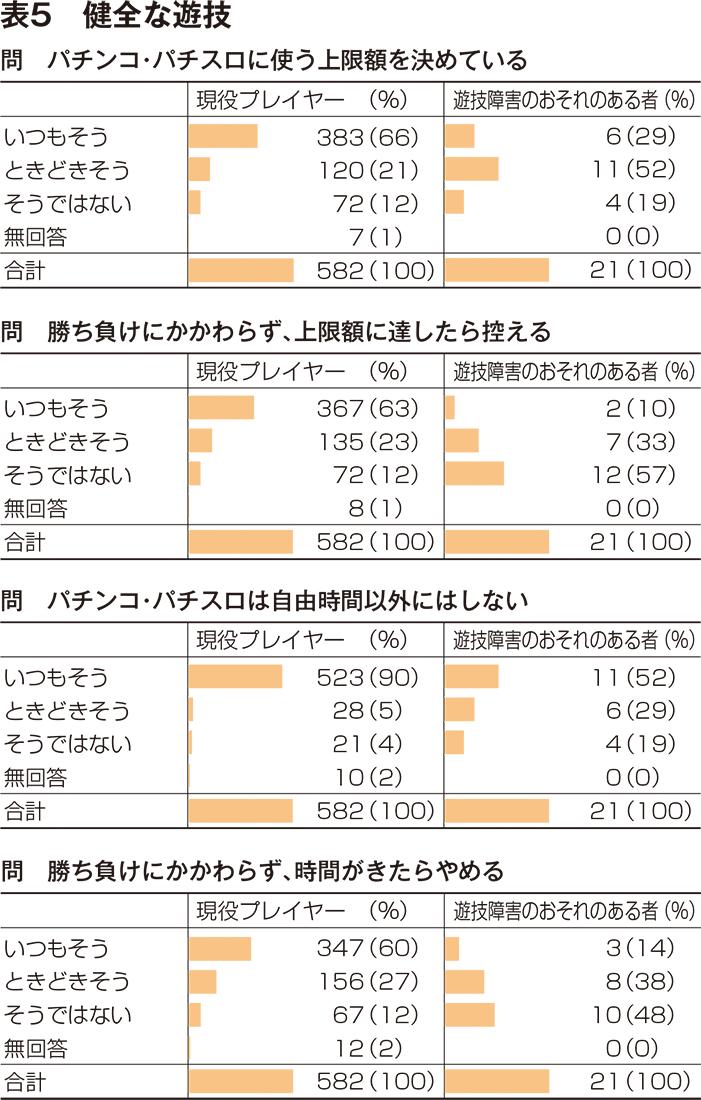 差が大きかったのは、離婚の経験が「現役プレイヤー」15%に対し、「遊技障害のおそれのある人」38%。預貯金がない人は「現役プレイヤー」17%に対し「遊技障害のおそれのある人」で48%。来店頻度は「現役プレイヤー」の最頻値が週1回に対し、「遊技障害のおそれのある人」は週2~3回、平均利用時間の中央値は「現役プレイヤー」が3~4時間に対して「おそれのある人」が5~6時間だった。このほか、「遊技障害のおそれのある人」は「使う上限を決めている」「自由時間以外にはしない」「時間がきたらやめる」など、「健全な遊技」を思わせる行動が少なかった。