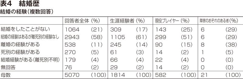 では、「遊技障害のおそれのある人」とそうでない人で、何か特性の違いがあるのか。調査では、結婚歴や世帯の預金額など複数の設問を「遊技障害のおそれのある人」とそうでない人(回答者全体・生涯経験者・現役プレイヤー)をそれぞれクロス集計し比較した。
