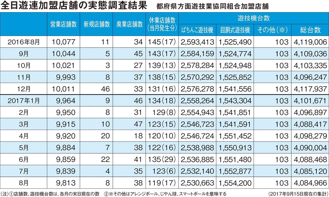 全日本遊技事業協同組合連合会が集計している組合加盟店舗の実態調査によると、8月末時点での営業店舗数は前月末より26軒少ない9813軒だった。 新規店舗数は8軒、廃業店舗数は38軒。