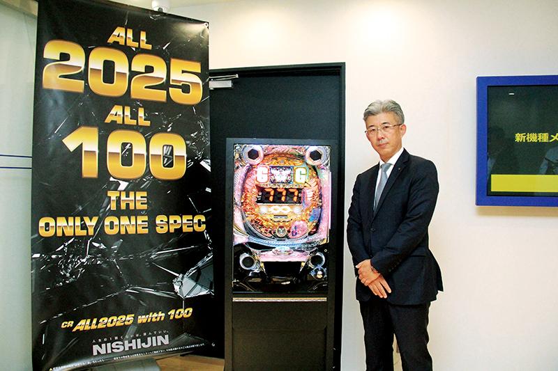 西陣は10月3日、都内の上野ショールームで新機種メディアカンファレンスを開催。ティザームービーを見た業界関係者の間で、評判と関心が高い『CR ALL2025 with 100』と『CR桃剣斬鬼』の2機種をプレス陣にお披露目した。